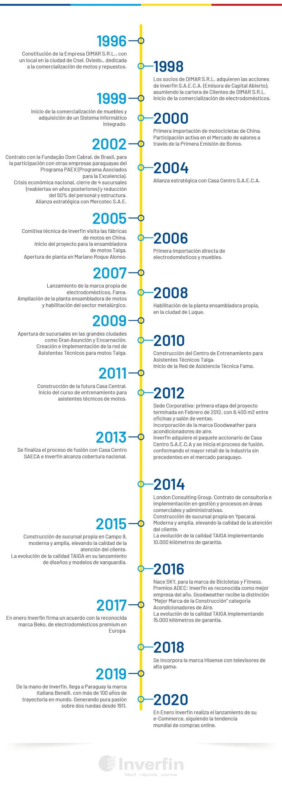 Inverfin S.A.E.C.A. es una empresa de Gente que Avanza con más de 20 años de dedicación, compromiso y trabajo. Se inició en el año 1996 en la ciudad de Coronel Oviedo en un pequeño local de venta de repuestos y motos. Actualmente cuenta con una moderna sede corporativa con una instalación acorde al negocio, con modernos sistemas de gestión y con tecnología de punta.